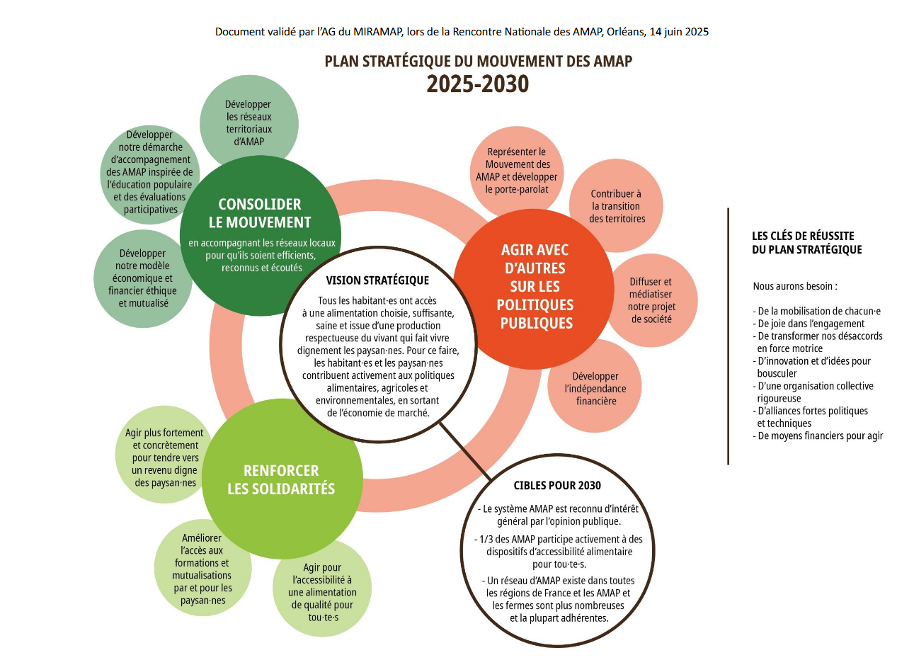 Le MIRAMAP s’appuie sur le Projet Stratégique du Mouvement des AMAP pour orienter ses actions. Fruit d’une co-construction inter-régionale, cette vision stratégique est une base pour rassembler le mouvement des AMAP, affirmer notre vision politique et renforcer nos coopérations. Chaque année, nous organisons notre assemblée générale et la Rencontre Nationale du Mouvement des AMAP dans une région d’accueil différente.