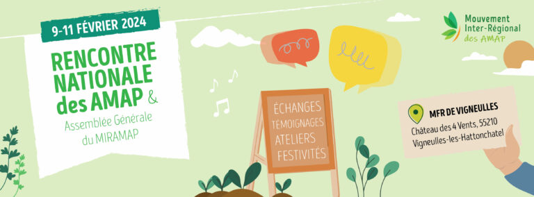 Le MIRAMAP et LorAMAP co-organisent la Rencontre Nationale des AMAP 2024 du 9 au 11 février 2024 à Vigneulles-les-Hattonchatel (55). Amapien·nes, paysan·nes, partenaires… retrouvons-nous pour échanger ensemble, partager nos problématiques, s’entraider, apprendre des expériences de chacun·e, se donner les moyens d’agir autrement, célébrer nos réussites… Bref : être ensemble et faire réseau !